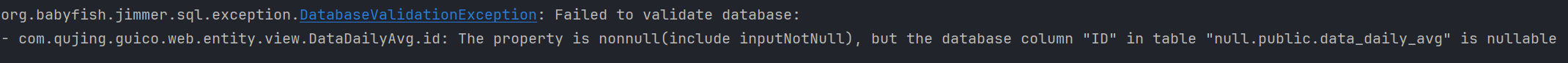 报错的原因是:jimmer发现,DataDailyAvg实体类的id在数据库是可为空的。但是实际上,这个视图的id实际上不会为空。因此,我们需要降低Jimmer的database-validation-mode 等级,使得其不至于妨碍项目的运行,同时也能给我们输出检查的对应结果。